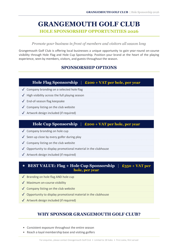 Club Update from the Board We’d like to share a few important updates with members. Professional & Management Update David Lee has now left Grangemouth Golf Club and has taken up the role of Head Professional at Shotts Golf Club. Since joining the club in 2021, David has provided valuable support to the Board, initially as Club Professional and later as General Manager. During his time with Grangemouth Golf Club, David was heavily involved in golf operations, junior coaching, shop development, and the implementation of the Scottish Golf systems that continue to support the club’s progress. The Board would like to thank David for his commitment and contribution. To ensure continuity, David has been invited to remain involved as a co-opted member of the Board in a voluntary capacity. He has accepted this role, and we look forward to continuing to work with him where his experience and support are needed. Open Competitions Now Live The Gents Open and Senior Opens are now live on the website. Members can book their preferred tee times via the club app. Early booking is recommended to secure your ideal slot. Pro Shop Update There are currently sale items available in the pro shop. Members are encouraged to pop in and have a look — there may be some great bargains available. Updated Contact Details To help us respond more efficiently, please use the correct email address for your enquiry: Please note that the general info@ email address is not monitored regularly. Using the addresses above will help ensure a quicker response. Kind regards,The Board