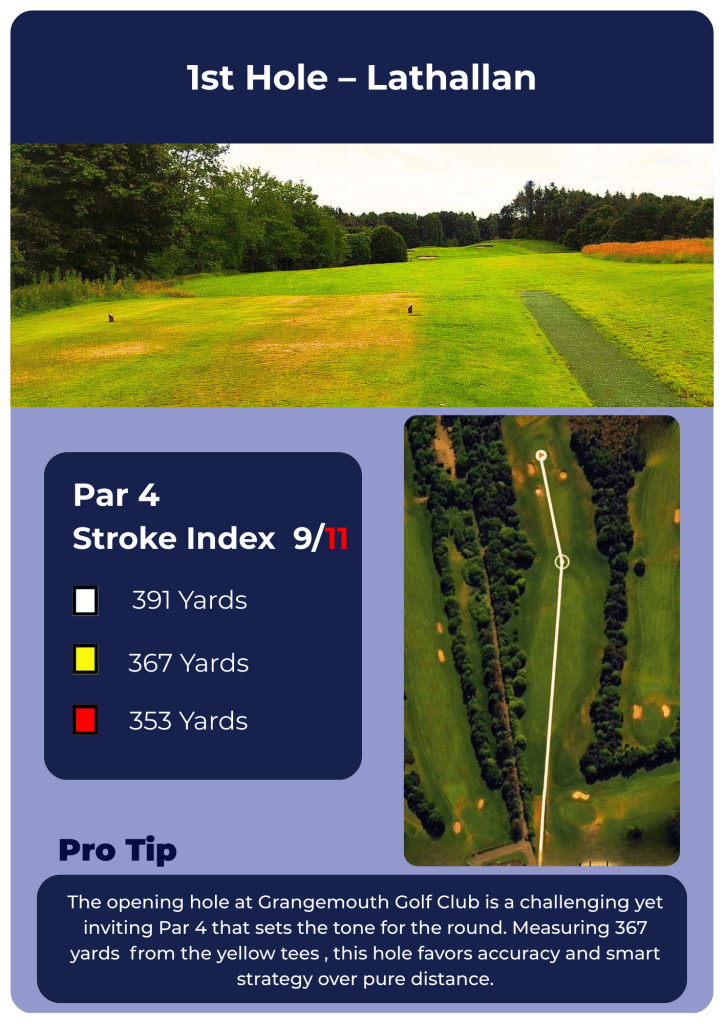 Welcome to Grangemouth Golf Club, a scenic and challenging parkland course nestled in Central Scotland. Below is your hole-by-hole guide to navigating our course, full of variety, character, and strategic challenges. Good luck and enjoy your round!